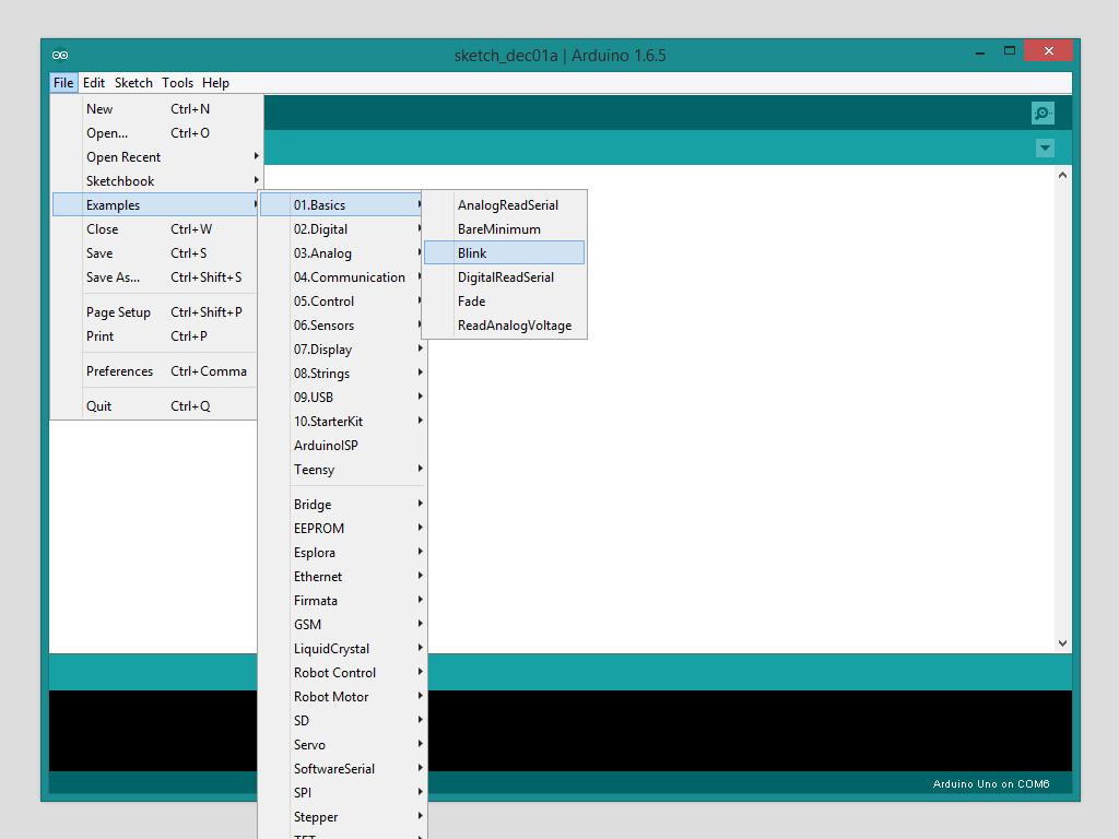 To test if you ARDUINO UNO or ARDUINO MEGA is working correctly we are going to use the “Blink” example. This is a piece of example code that makes the led on your board blink. To open this code follow these steps:
