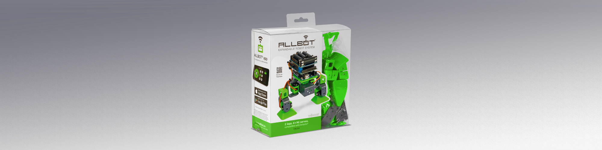 The VR204 two legged AllBot is a modular robot system with Arduino® compatible robot shields. Build and enhance the robot, learn how to program, use the app and have fun!