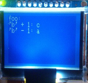 #include <Sparki.h> // include the sparki library void setup() { } void loop() { sparki.clearLCD(); // erase the LCD char foo; // declares a variable of type chracter sparki.print( "foo: "); sparki.println( foo ); foo = 'b' + 1; sparki.print( "'b' + 1: "); sparki.println( foo ); // b + 1 foo = 'b' - 1; sparki.print( "'b' - 1: "); sparki.println( foo ); // b - 1 sparki.updateLCD(); // put what has been drawn onto the screen delay(1000); // wait 1 seconds (1000 milliseconds) } |