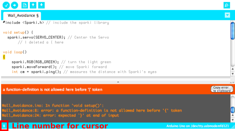 First of all SparkiDuino highlighted a curly bracket at the beginning of the loop function. This is our first clue that the error is somewhere near the character that SparkiDuino highlighted. This is the place where SparkiDuino first encountered the error, so we know that the error is above this highlighted line of code.