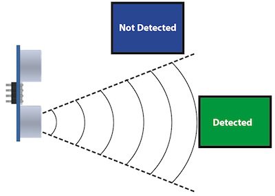 This sensor finds objects with sound the same way a bat or dolphin does. One part of the sensor is a speaker that sends out a sound wave. The other part is a microphone that then measures how long it takes for the sound wave to come back. The longer it takes to come back, the further away the object: