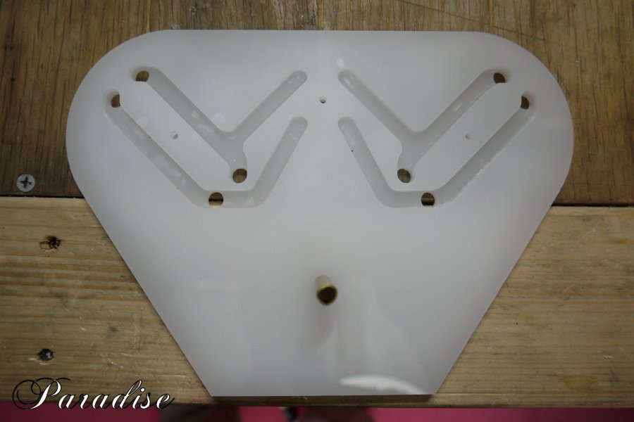先のV型2気筒空気エンジンのマニホールドをビニールチューブで配管してたのが不格好なので バックパネルの中に給排気管路を彫り込んでみました。 この改良で後面がスッキリして見栄えが 良くなりました。