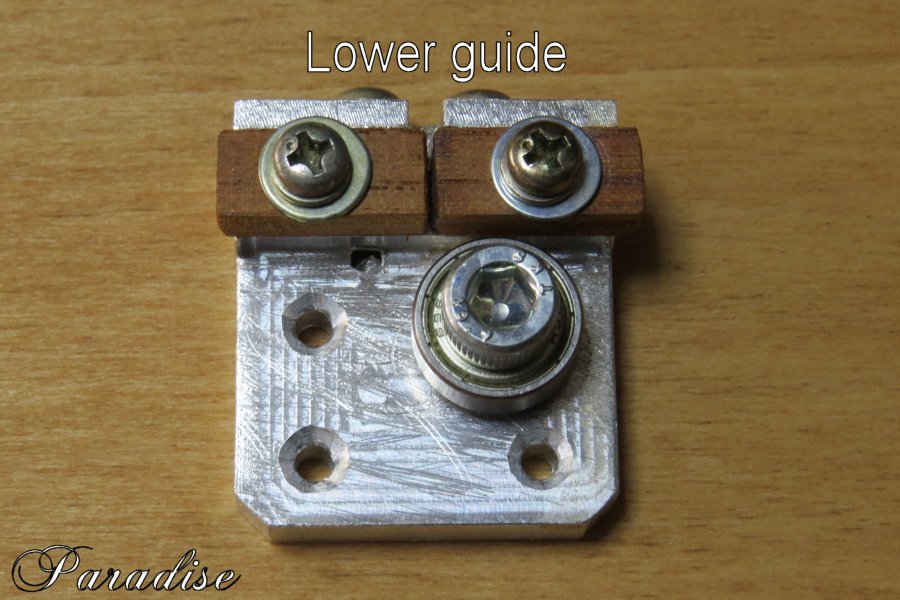 | 上部ホイールが取り付くフレームは木なので、ここに幅30㎜高さ80㎜深さ3㎜のポケット加工を行い、厚さ5㎜のアルミ補強板を 嵌め込みます。これは、半締めの状態でブレードの張りを調整するのでフレームを傷めないための処置です。 |