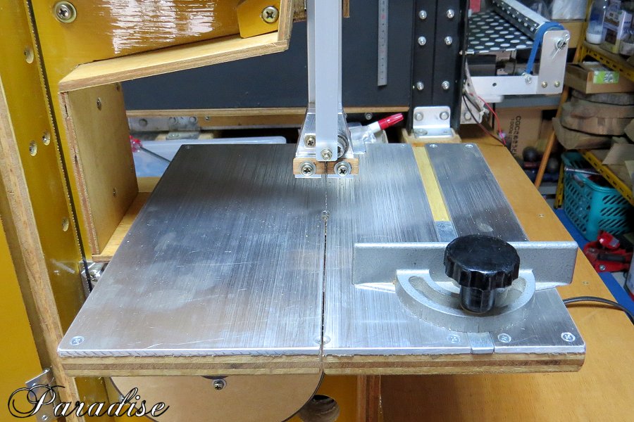 出来上がったバンドソーは木板やアルミ板・アクリル板などの直線切りや曲線切りが安全かつ快適に行えました。 今回は、完成後の塗装を出来るだけ省くために、安価なウレタン塗装型枠合板のコンパネを使いましたが、強度が高い (積層枚数が多い)構造用合板を使われることをお勧めします。また、木材で作る場合(特に合板)は表示値と実際の 厚みに誤差があるので現物に合わせた加工が必要です。 |