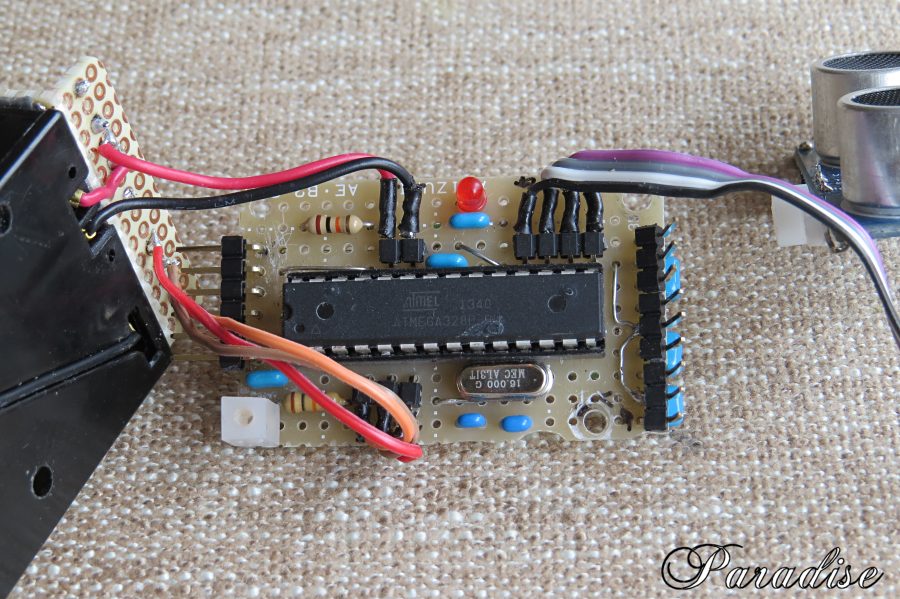 マイクロサーボモーターSG90を連続回転に改造し、駆動用モーターに使った超小型の無限軌道車を作りました。 今回の作品はアクリル板をCNCフライス盤を使いフレームやローラーを作り、クローラーにはOリングを使った 簡単な構造です。 小さなサーボモーターに直接ローラを付けると負担が大きいのでフレームを強固に作り、 サーボモータには回転以外の負荷が掛からない構造としました。 サイズL10cm、W7cm、H9cm この作品は超音波センサーを用いた自律走行とテレビ用の赤外線リモコンを使った手動運転が出来ます。 |