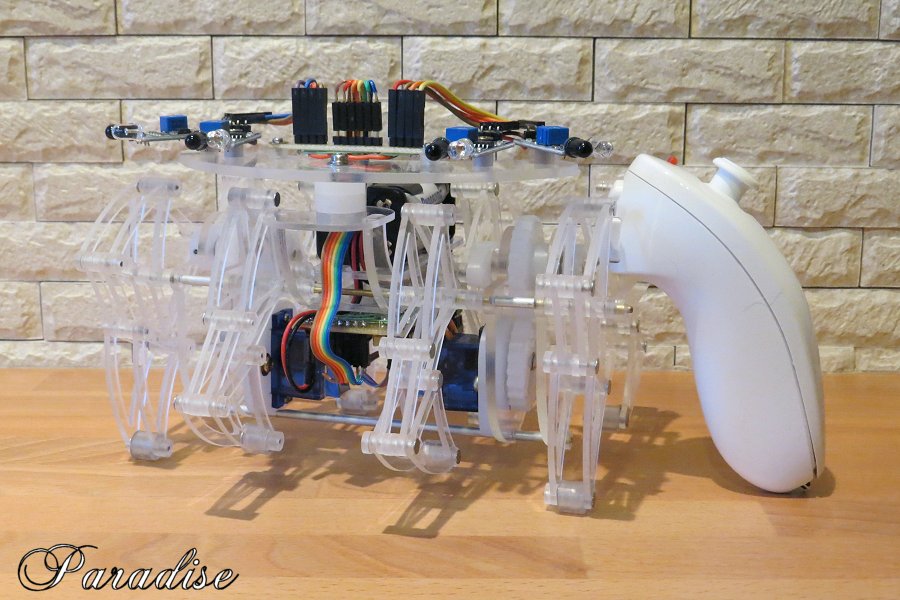 テオ・ヤンセン・メカニズムを応用したラジコン・ロボットの続作ですが、ロボット側とコントローラー側の双方に WiFiモジュールESP8266 WROOM-02(以下、WiFiモジュールと表記)を使い、スマホを使わないWiFi通信を実現しました。 今回の目玉は本体の小型化とWiiヌンチャクを改造したWiFiコントローラーです。 これによりジョイスティックを使って コントロール出来るようになりました。また、今回は自律歩行の障害物監視に赤外線センサーを初めて使用しました。 (開発中、WiFi通信の不通がソフトウエアではなく、WiFiモジュールの不良が原因だと気づかずに苦労しました) |