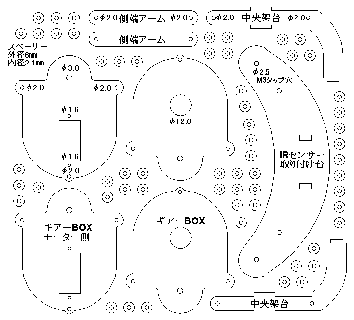 3㎜厚アクリル板の切削画像(この画像は実寸ではありません)DXFファイルは「こちら」) 3㎜板はギアーBOXや中央架台とIRセンサー取り付け台など骨格となる部品です。 2㎜板のバッテリー台と基板取り付け台を中央架台にサンドイッチ状に装着、中央架台とIRセンサー台を接着します。 |