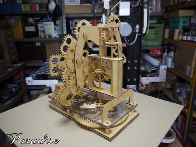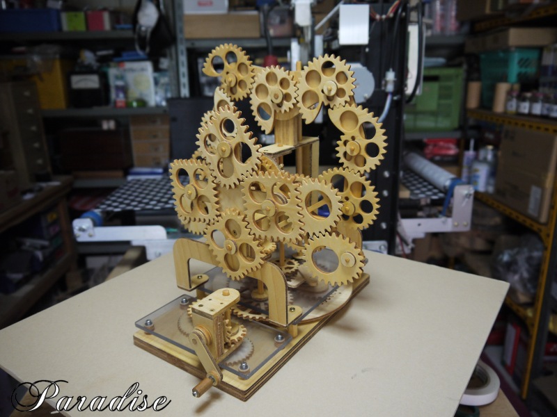 先に作ったアクリル製の非円形ギアを発展させてハンドルを回すと色んなギアが動くおもちゃです。 ハンドルを回すと木のベベルギアを介し円形ギアで減速した後、遊星歯車を動かします。遊星歯車を ロックすると止まってた別のギアが動きます。
