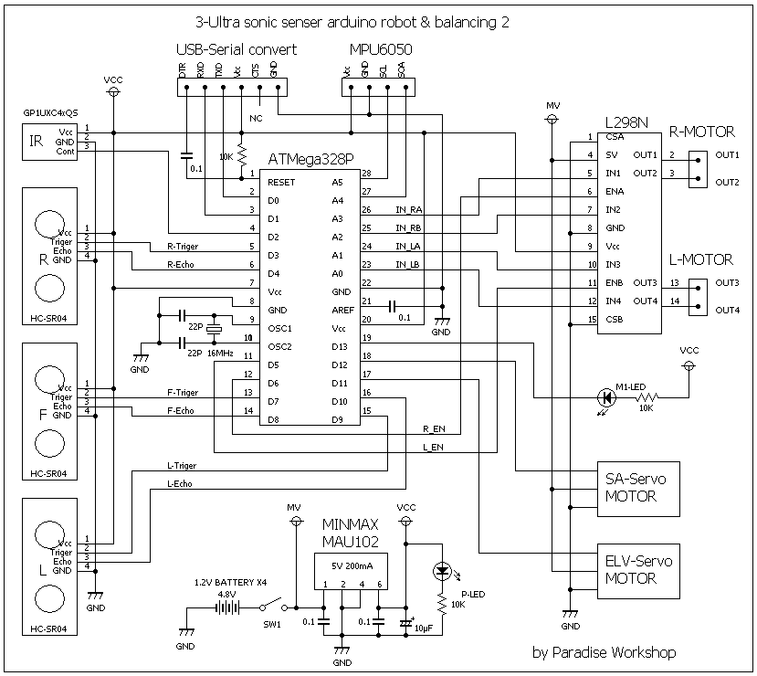 マイコン(Arduino)の勉強を始めて約半年、今回は3つの超音波センサーを使い障害物を避けて走行する ロボットをRCサーボを使い、自動で倒立する複合型のロボットを作りました。ハードウエアについて