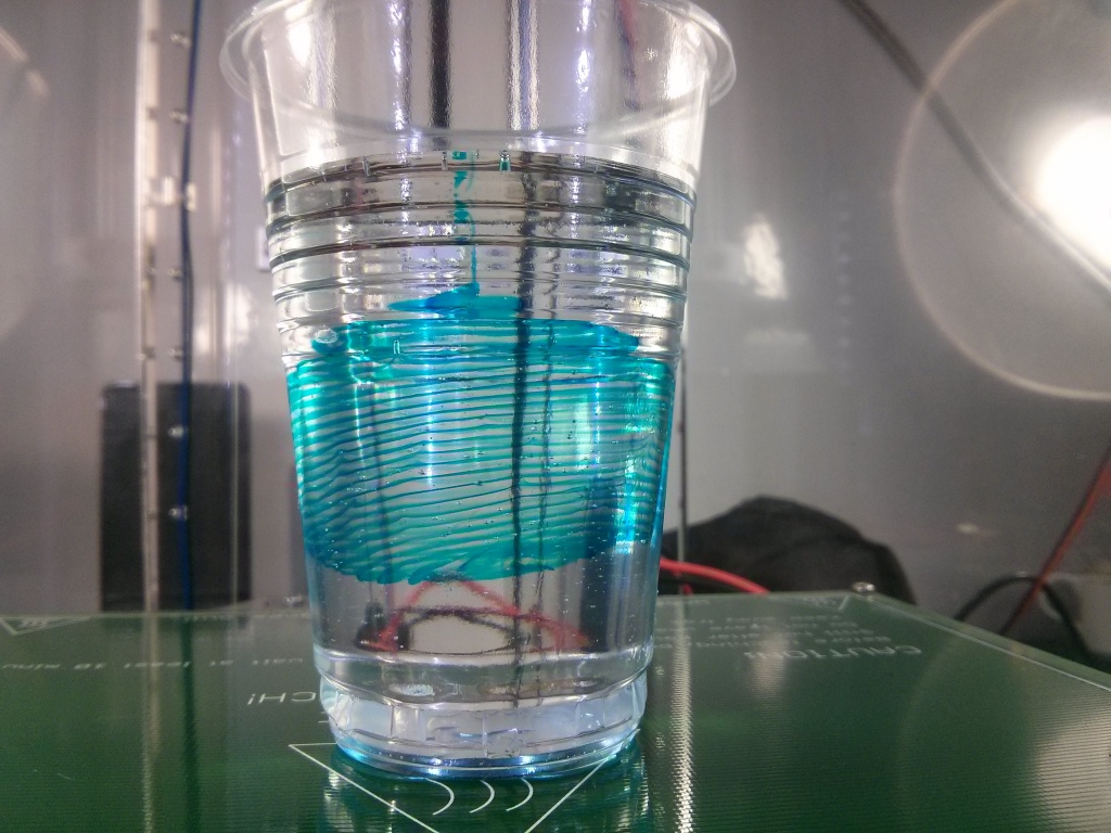 Fellow Shenzhen/Hong Kong maker, Alex Hornstein, had an interesting idea of how to dispense voxels in 3D space using food coloring and corn syrup, something he calls “3D painting”. To put it simply, he added color to corn syrup inside a syringe and dispensed it into a plastic cup filled with transparent corn syrup. Since they have the same density, the colored voxels will not sink or float, just remain in the location they were dispensed.