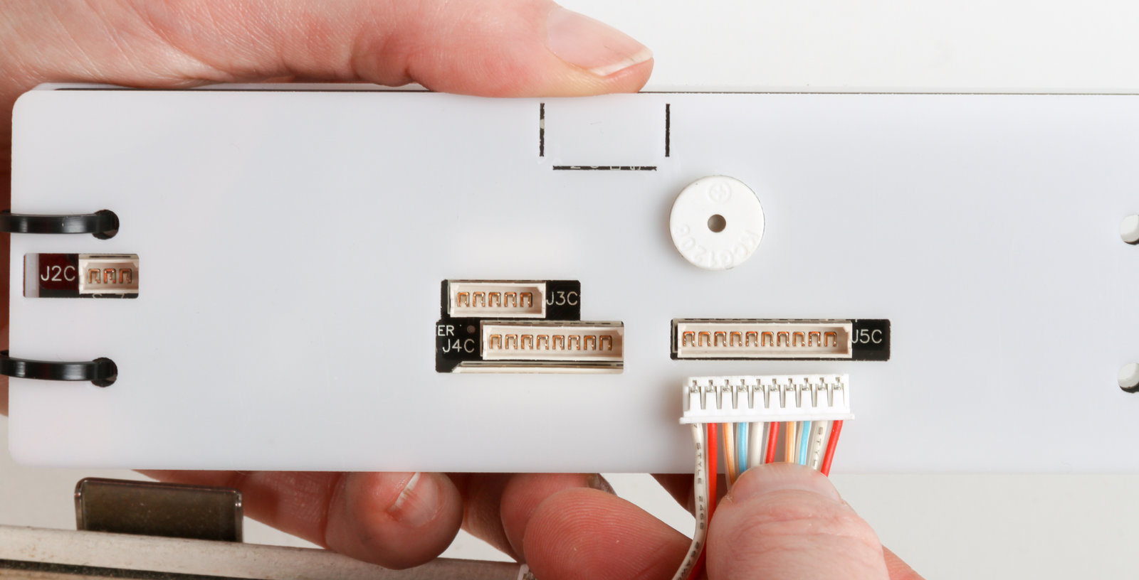 Now, let's attach the first connector to the new AYAB interface. Hold the board as shown here, such that the majority of the exposed connectors are on the left, and just the one little connector ("J6C") is exposed on the right.