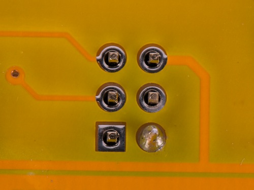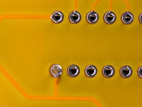 (The view above shows the header at J4, from the underside of the board, with one of the pins soldered.)