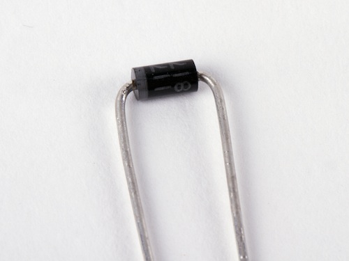 Install the diodes in positions D1 and D2. Diodes have polarity - be sure to match the stripes on the diode with the stripe on the PCB.