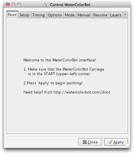 Simply click the "Apply" button, and plotting will begin (assuming, of course, that your WaterColorBot is powered, connected via USB to your computer, and that the carriage is already in the upper-left START corner). If you wish to close the extension, click the "Close" button. To select another tab, click on the desired tab.