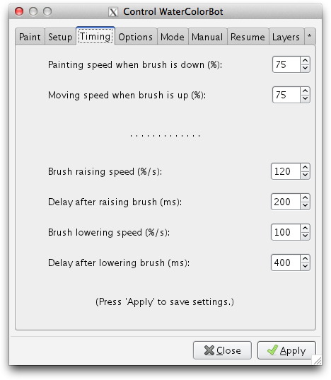 The Timing tab lets you adjust various timing parameters that control the WaterColorBot.
