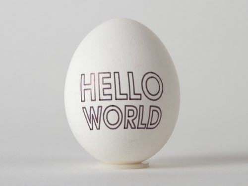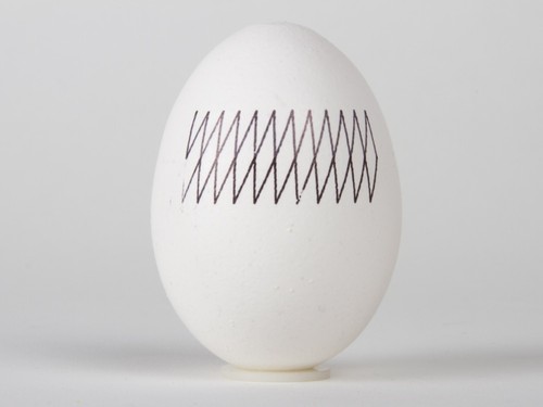 This was printed with the Deluxe EggBot on a chicken egg with an Ultra Fine Point Sharpie. The egg was oriented with its "fat" side (the side pointing down in the photo above) pointing towards the egg motor (headstock).
