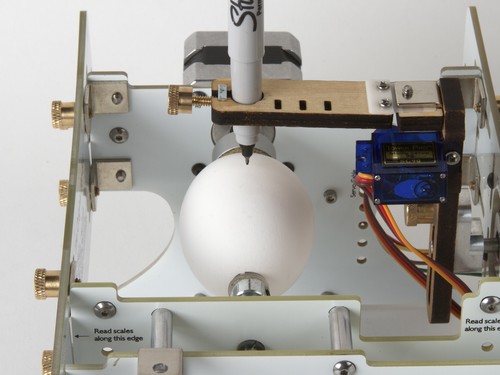 If the pen motor is positioned too high in the vertical slots (here, at the top of its slots while printing on a chicken egg), the pen will not make contact over the full surface. To correct this, lower the motor in the slots.
