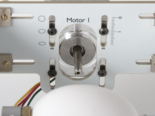 The pen motor can be moved vertically to adjust the pen arm for drawing on spherical or ellipsoidal surfaces. For drawing on chicken eggs, we normally position the pen motor about in the middle of the slots as shown here. For a sphere, position the motor at the very top of its slots. For a more elongated egg (maybe a turkey egg?) you may need to go lower yet in the slots.