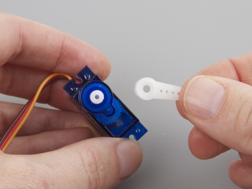 Take the servo horn, and push it onto the servo motor shaft. (Do not screw it in place; its position is not final yet.)
