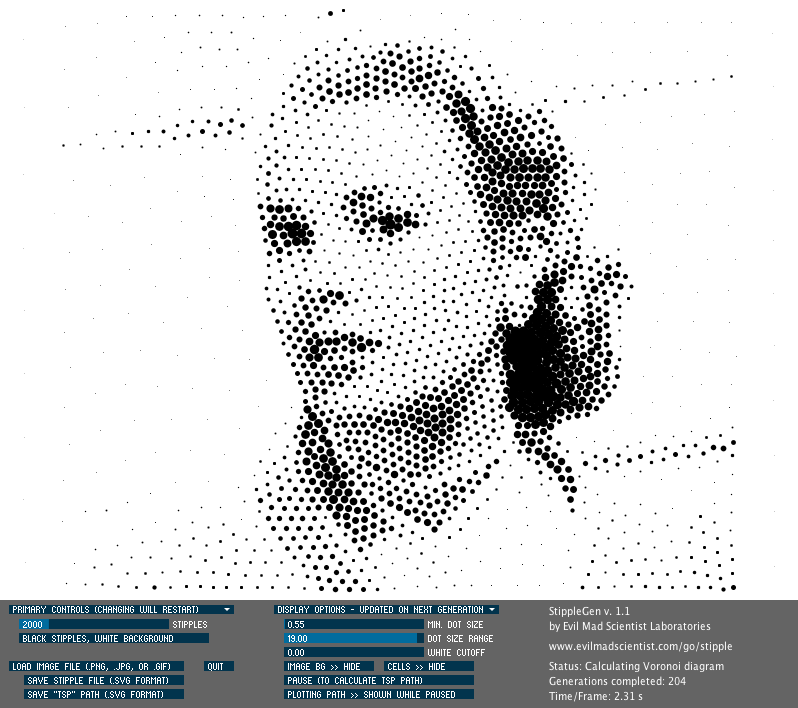 - Allow it to run until the stipple distribution stops changing much, and adjust the display options (dot size and so forth) to your taste.