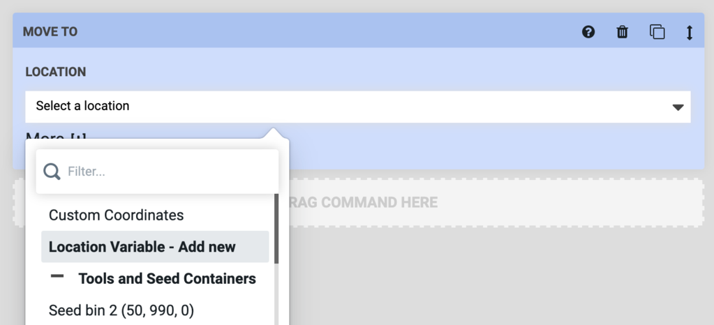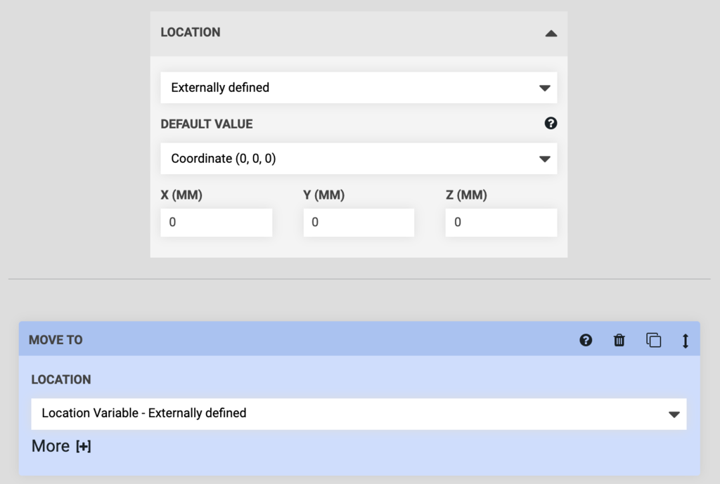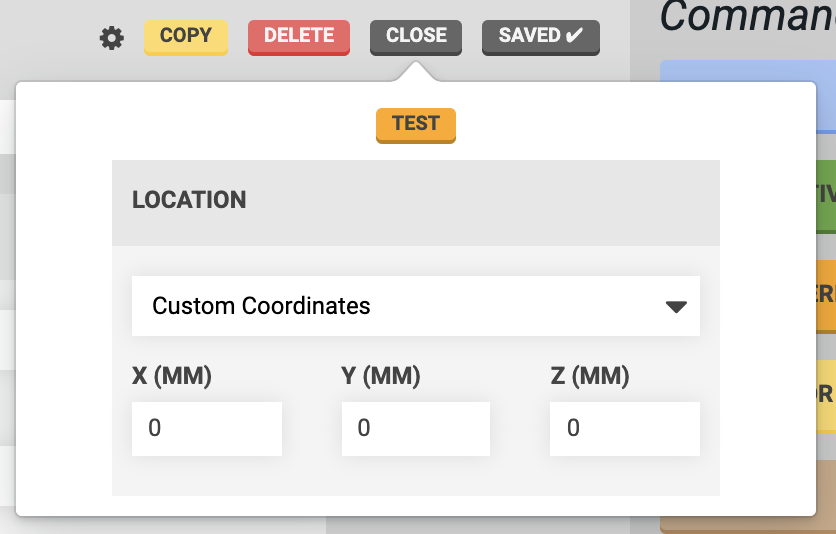 - The MOVE TO command has been simplified to only show the Location field by default. X, Y, and Z coordinate fields will only be shown if Custom Coordinates is chosen for the location. This provides a more compact layout, useful for displaying more sequence steps on the screen at once.