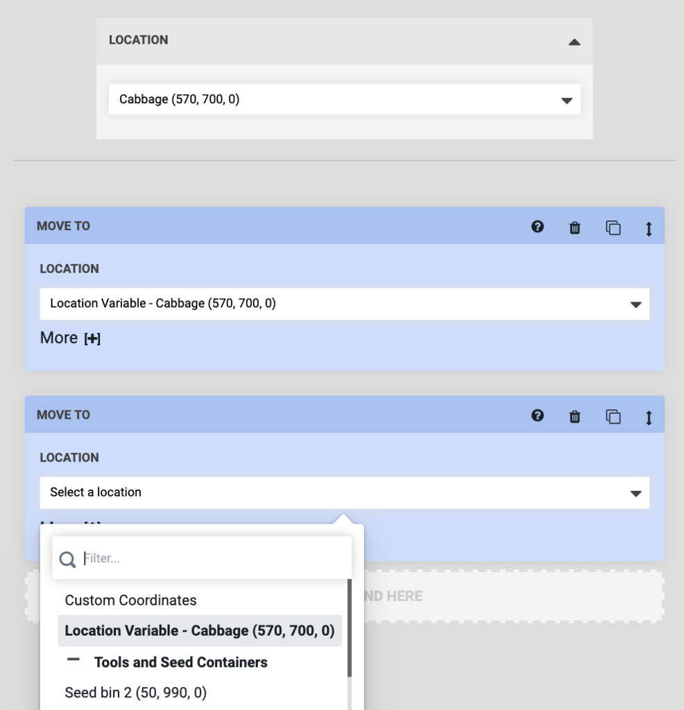 1) You can define the variable's value right here in the sequence with Custom Coordinates or the location of a single Plant, Tool or Seed Container, or Map Point.