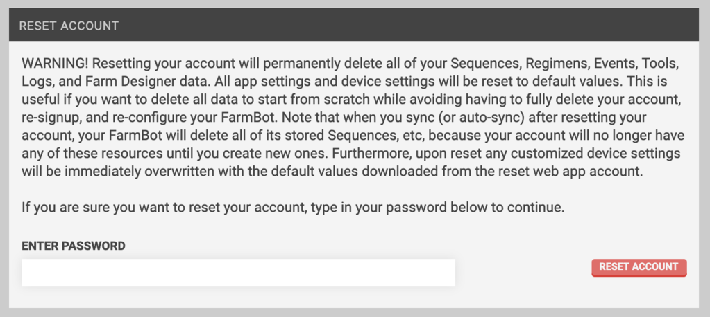 There is a new option on the account page to reset the user account. This is useful if you want to delete all data to start from scratch while avoiding having to fully delete your account, re-signup, and re-configure your FarmBot.