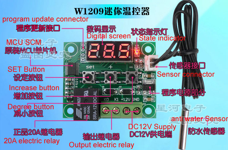 - W1209 Thermostat Board (3 7S-LED, 3 keys, relay)
