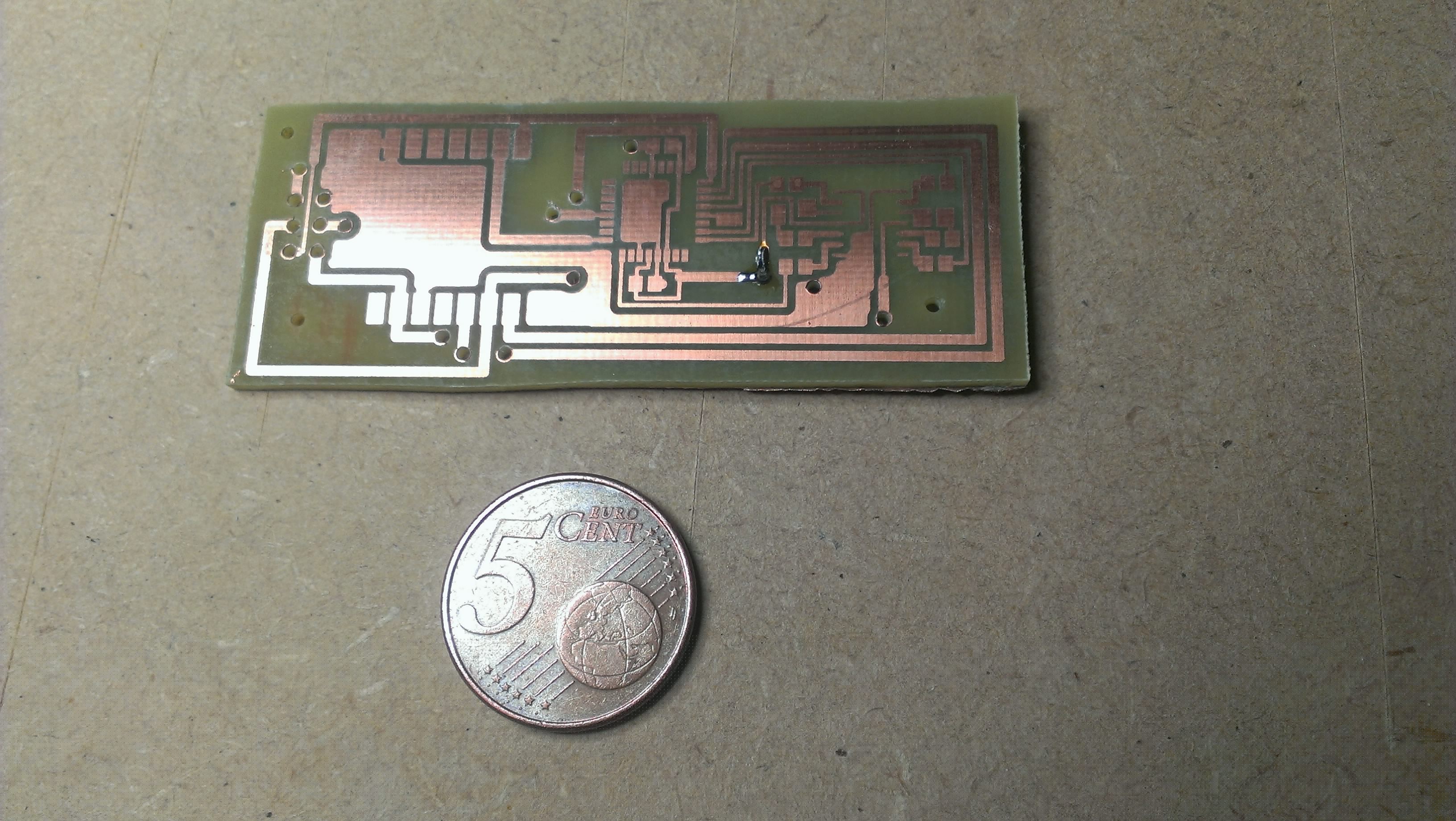 I also wanted to use the Arduino toolchain because of the easy availability of a large selection of libraries, but a standard Arduino is way too big and heavy. So I decided to develop my own, minimalist board, which ended up holding only 11 components: 6 resistors, 2 capacitors, an RF12B 433 MHz module, an Atmega328 microcontroller and a LB1836M motor driver IC. The PCB is designed in EagleCAD and produced using the UV-exposure method.