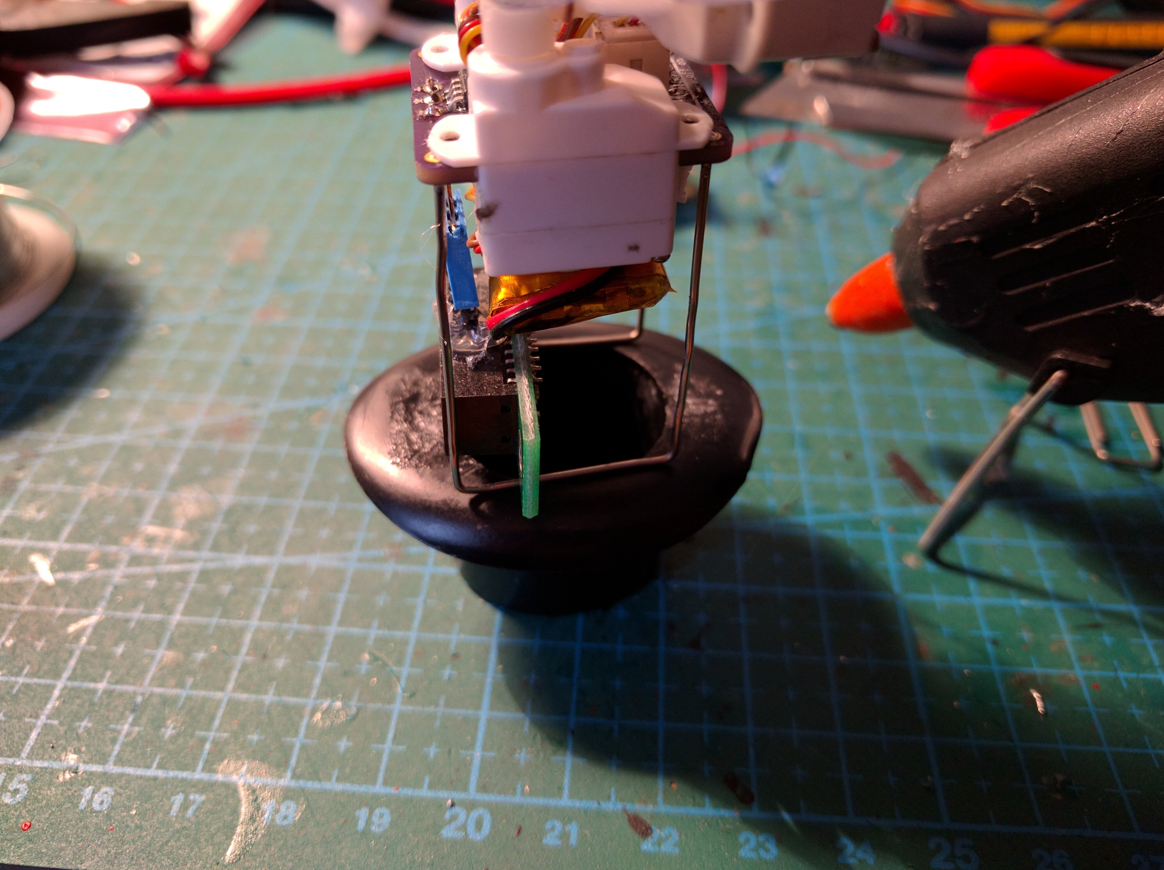 I quickly desoldered the fried module and switch, and soldered new ones (ugh, my stash is running out). Uploaded firmware, uploaded code, connected battery, connected servos, ran it: