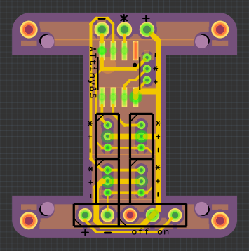 AVR Memory Usage ---------------- Device: attiny85 Program: 1006 bytes (12.3% Full) (.text + .data + .bootloader) Data: 19 bytes (3.7% Full) (.data + .bss + .noinit)The walking code turned out to be much larger than I expected -- even though it's mostly just calling a single function with three 16-bit integer parameters. I guess I could scale them down to bytes to save some space...