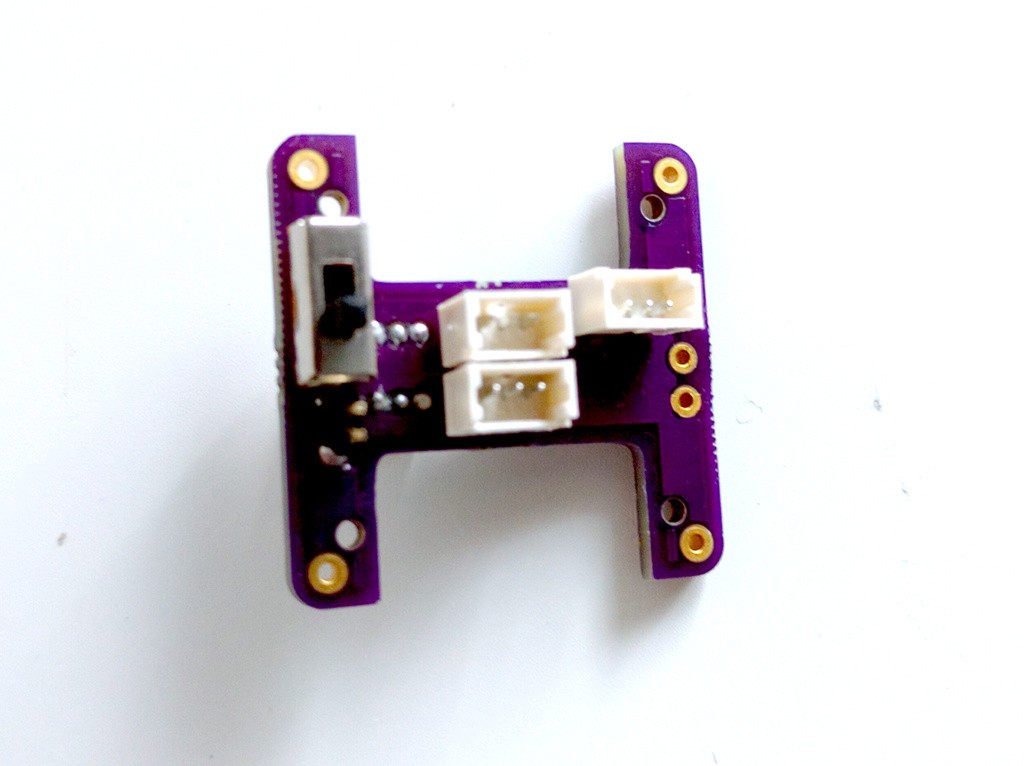 Assemble the PCB -- solder the switch, the power socket, the servo sockets, the chip. Make sure to put two of the servo sockets on one side, and two on the other side -- so that you don't have to move wires through the PCB.