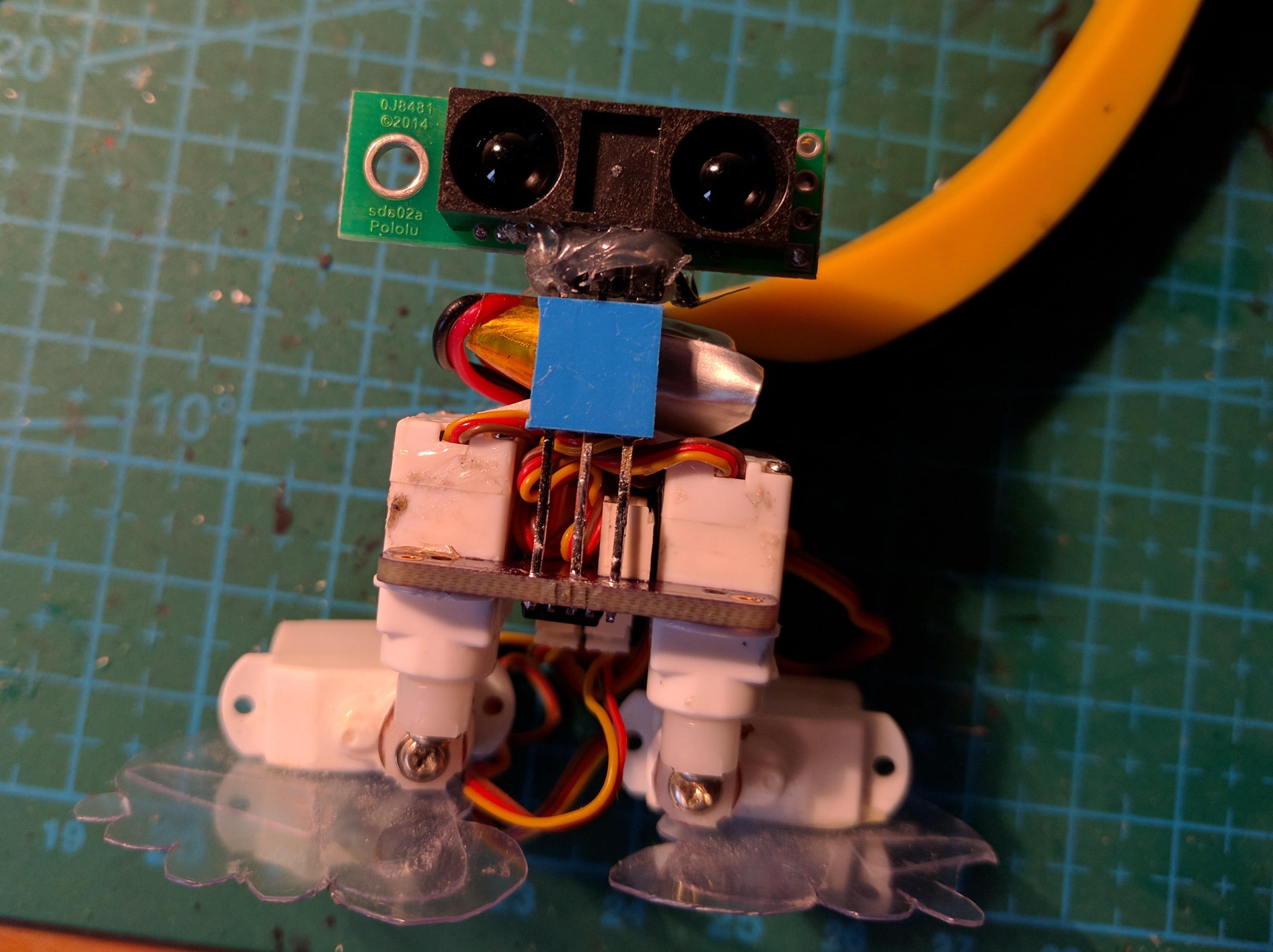 Finally, a video of the robot doing its thing. It checks the distance at every step, at the moment when the body is horizontal. I used the fact that with each step it's looking in a different direction, and I made it choose the direction of the turn based on that. Oh, I also sped up the final version of the code. Unfortunately, I had to remove the beeping code to make it all fit in 1kB for the challenge.