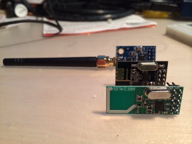 (Figure: Three varieties of the NRF24L01+ dongle. The green version is the one currently used)