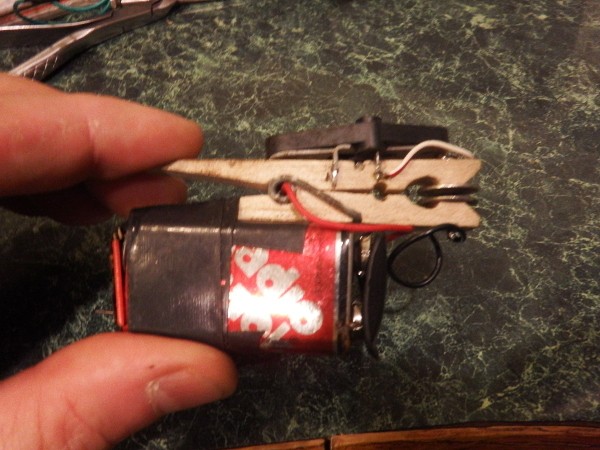 Also of note: It's hard to see from the photo, there are 2 thumb tacks sticking out from the base of the battery. Take the whole unit and press it into the side of a tree or wooden molding and run the trip wire across the room to another thumbtack.