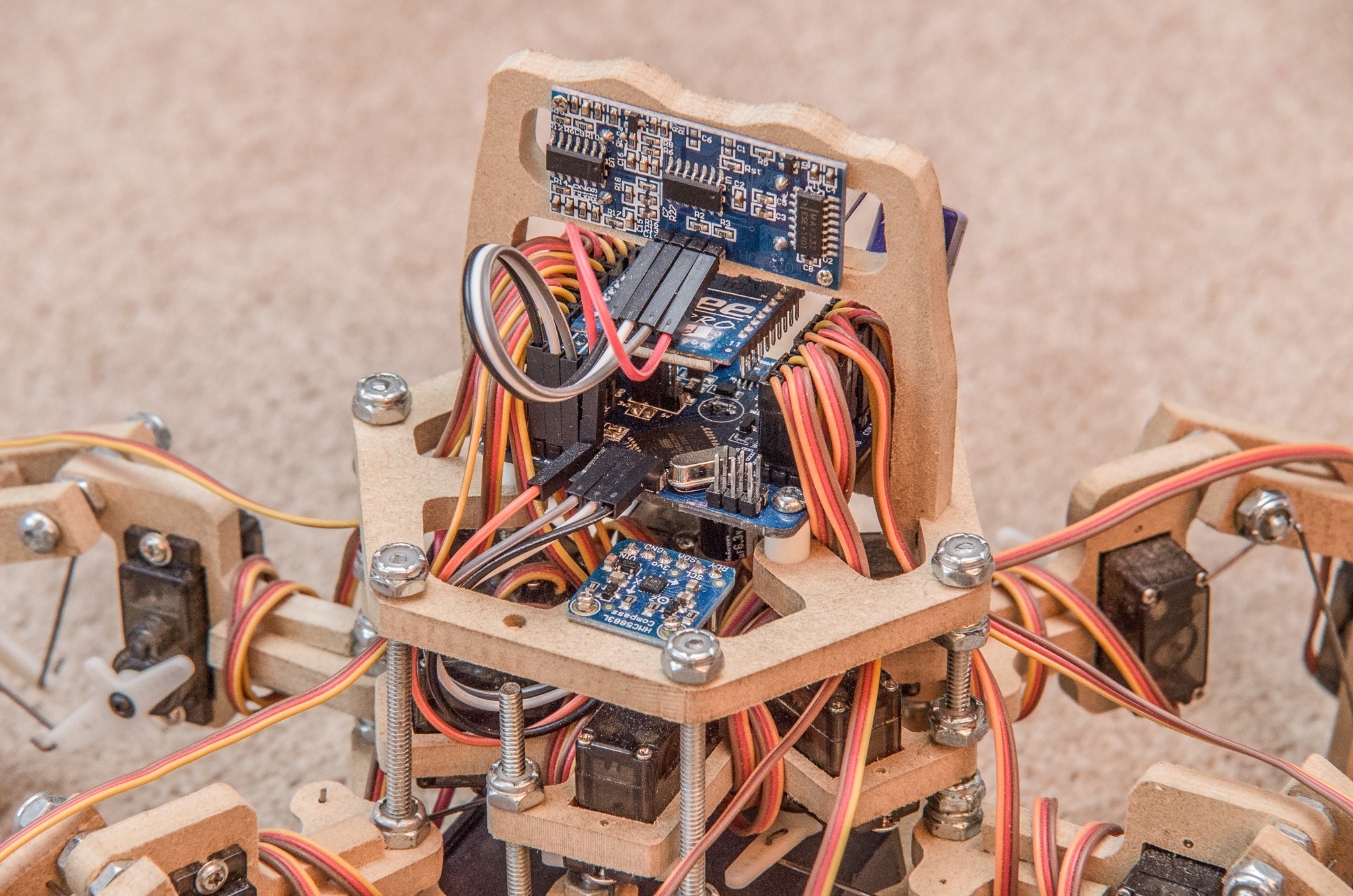First are the frame plans. The frame is one of the biggest advantages which Stubby holds over other, more expensive hexapods. The first difference is the materials: Stubby is designed to be cut from 1/4" MDF using a scroll saw. (However, the design is adaptable enough to be able to use other materials as well, and the community has modified these plans for use with a 3D printer, laser cutter, etc.) The frame is quite easy to make; simply print the plans, tape it to an 8.5x11" sheet of MDF, and cut along the lines. The second difference is how the servos are attached to the legs: Stubby uses push rods to convert distance to torque, allowing Stubby to work with cheap, low-torque servos (at the expense of being a bit more limited in leg movement). This is the biggest factor in being able to keep below $150 in components (this assumes you have no parts in your parts bin, but does assume that you have all the required tools already).