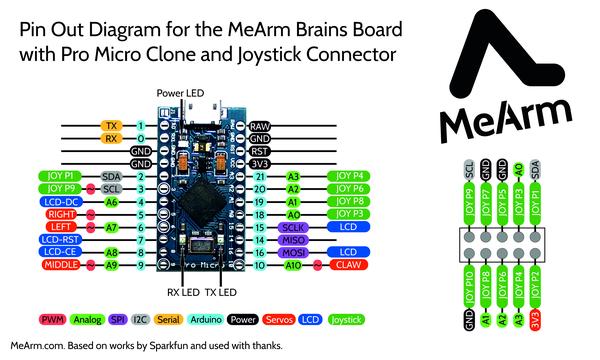 Now you can start experimenting. The MeArm Brains board comes with a controller and LCD and we have examples of how to get these running. But the controls aren’t perfect for a reason, so you can make them how you like them! Check out the code and our Pin Out diagram so you can get started!
