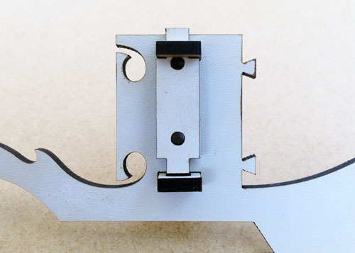 Slide one end of the pen arm into the slots in the main chassis, with the pen mounts facing inwards towards the hole in the base. Drop the other end down into place so that it sits in nicely.