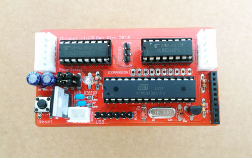 Solder the stepper and power sockets in place. For the two 5 pin stepper motor sockets, you need to make sure that the side with two notches in it is on the inside of the board - check the photo. They should clip satisfyingly into place. The power socket should have the notch facing the edge of the board.