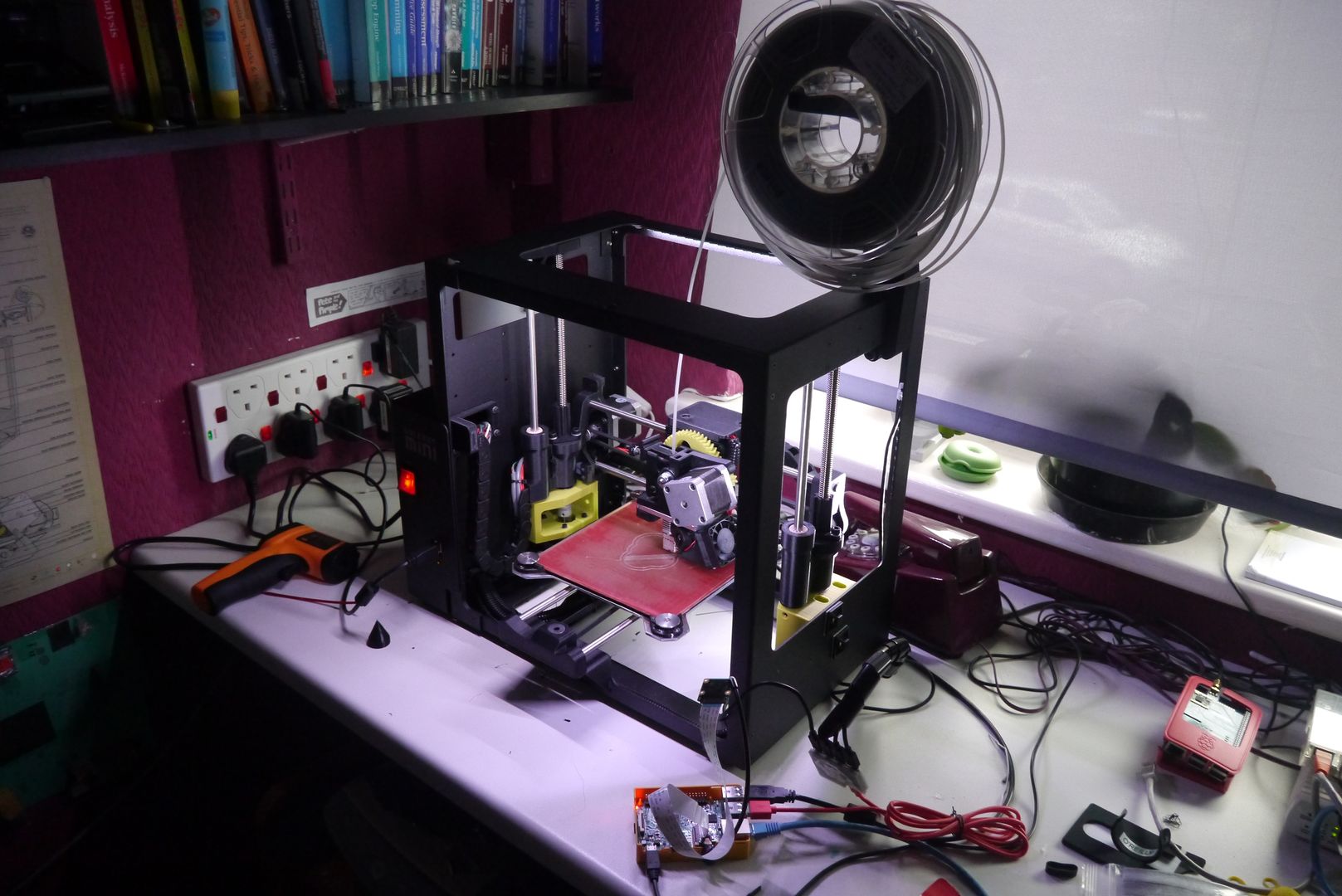 Here’s my PrintRBot and its new wooden tower/spool/RPi/PSU mount. […] It’s currently printing dust-extraction vacuum adaptors for my workshop. The RPi is in the red case on the left side of the tower (WiFi stick antenna hanging down, camera mount clipped to print-bed. I use a NoIR camera, mainly via accidental purchase. I keep meaning to light the whole thing up with LED striplights, but the Leg Lamp will do for now.