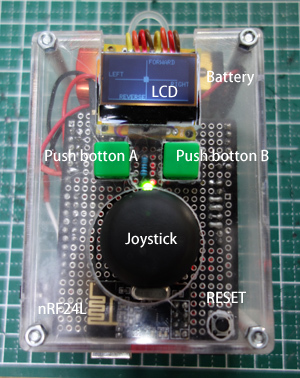 前報で液晶画面を追加したジョイスティックコントローラをケースに組み込みました。 ケースはダイソーで見つけたクリップが入っていたケースがサイズがぴったりでした。ケースに困ればダイソーに行けばなにかしら見つけることができます。しかも中身はそれなりに活用できてまことにお得です。 さて、ケースの加工は薄いプラスチックですのでなんなく完成。ちょっとした配線と電源スイッチとリセットボタンがないと不便なのでこれらを追加して完成しました。 画面にあるプッシュボタン2個はいまのところ使いみちがなくただの飾りです。 それにしても最近はaitendoさんにお世話になりっぱなしである。品質も問題なく、送料も他のパーツ屋に比べると安いし、何と言っても他では見られないようなユニークなパーツがある。最近は選別の際の第一順位になっている。 (2015年6月)