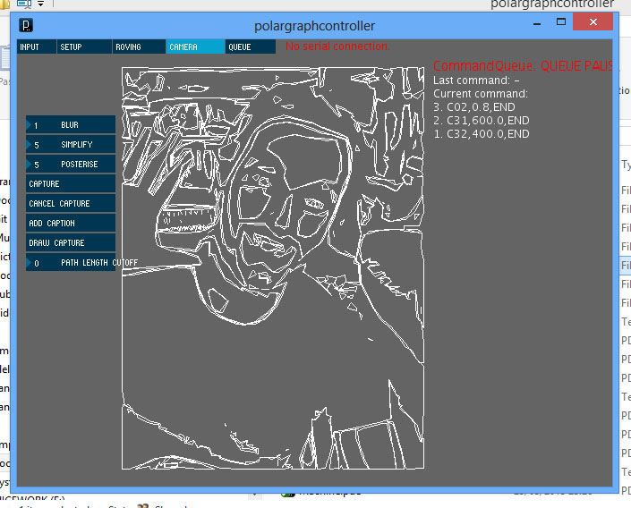 Hit capture to snap a frame, and get to see (to some extent) the drawing sequence too – darker lines are drawn first. Cancel capture discards the snap and returns to the live feed. Add caption doesn’t work yet! Oops! Draw capture confirms the snap and converts it to commands, and packs them into the command queue. It also saves the image as a SVG somewhere too, in case you need to repeat it.