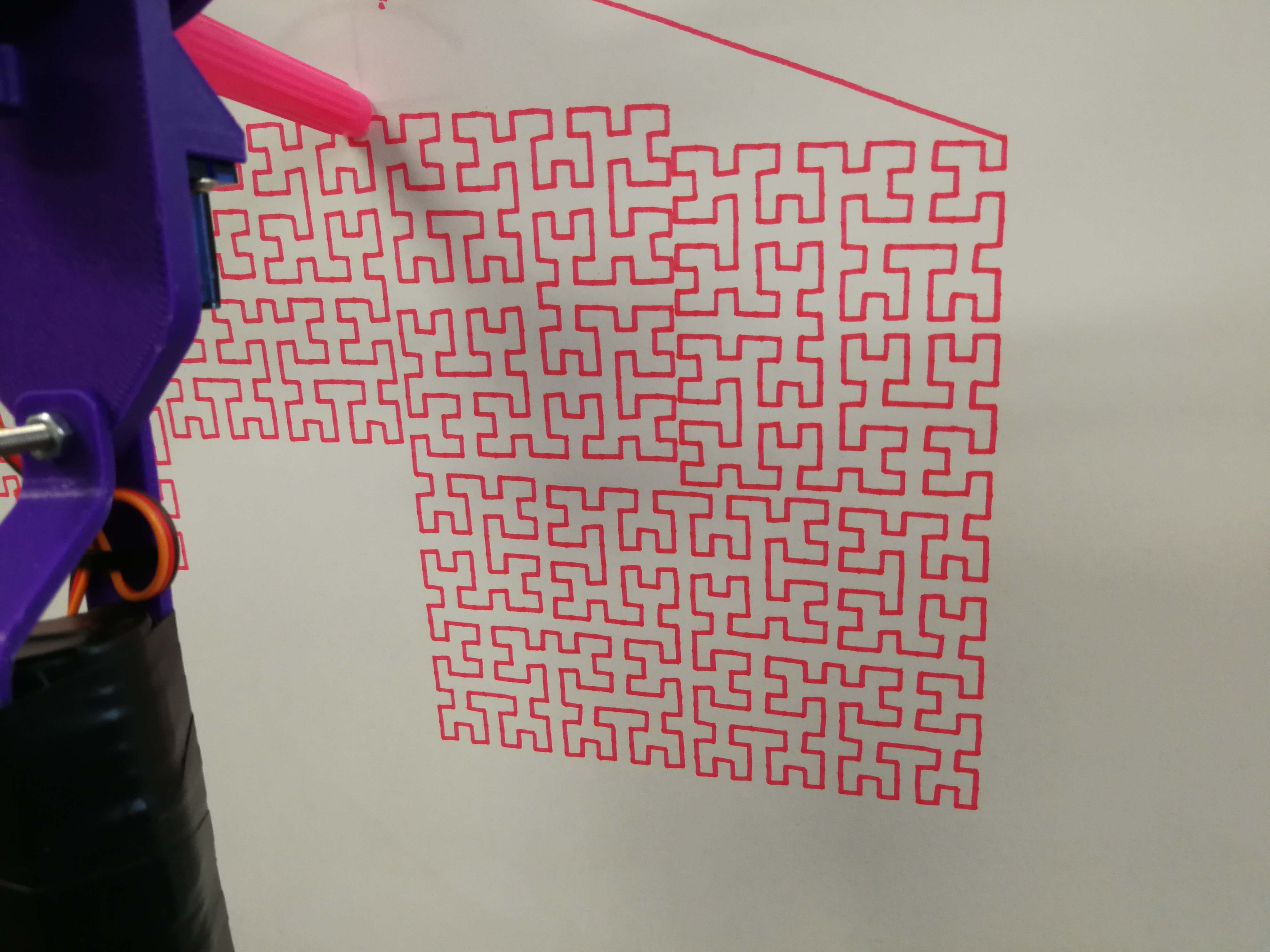Hypothesis: This hilbert curve is a bit of a "torture test", cramming in as much back-and-forth as possible to try and prompt tiny errors, then magnify the consequences of it. I'd be amazed that physical errors (overshooting or dropping steps) would be so consistent between runs, and that there was no sign of them during other drawings (the crown)... But I've been amazed before. Perhaps if you drew hundreds of tiny crowns you'd find that they lost integrity too.