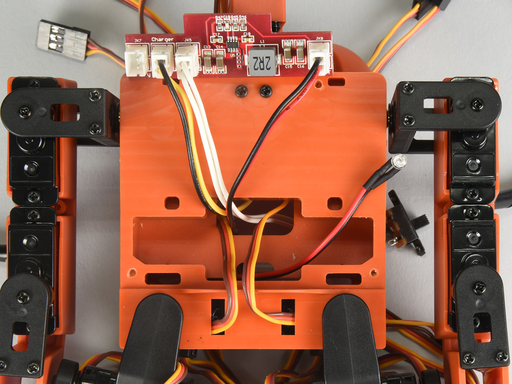 According to the figure, insert the power connecting wire, switching wire, charging socket cord, LED wire and 17 sets of servo wire into their corresponding positions in the main control panel.