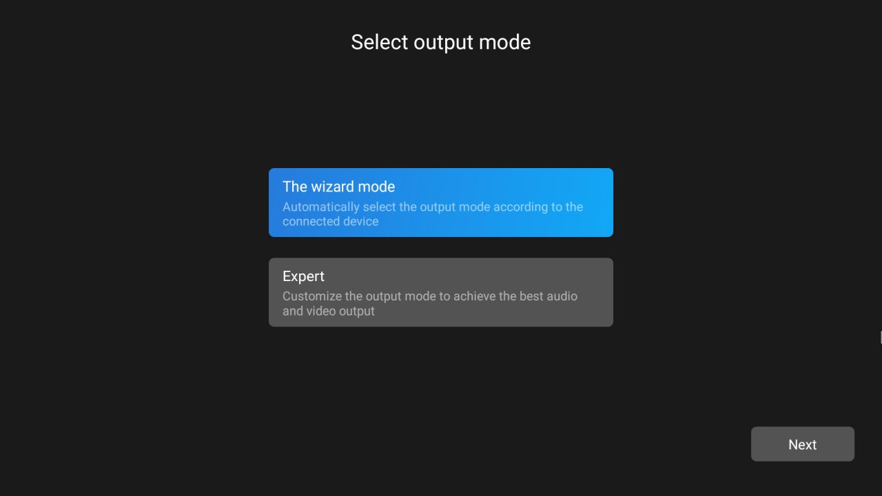 - Setup of audio/video output modes – you can choose between Wizard mode (automatic configuration) and Expert mode (customize resolution, HDR mode, video frame rate and Audio output)