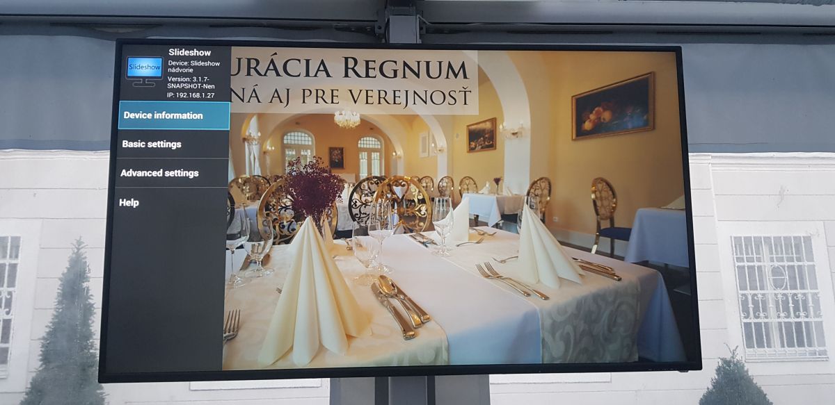 Art Hotel Kaštieľ is a small luxury hotel in Slovakia. Management of the hotel were thinking about displaying advertisement for their services in the reception area and in the courtyard, but were missing simple digital signage solution. They already had regular 50″ Samsung TV near the reception for playing TV channels (mostly news channels), but setting it up for displaying banners and videos with advertisement was time consuming and not at all user friendly.