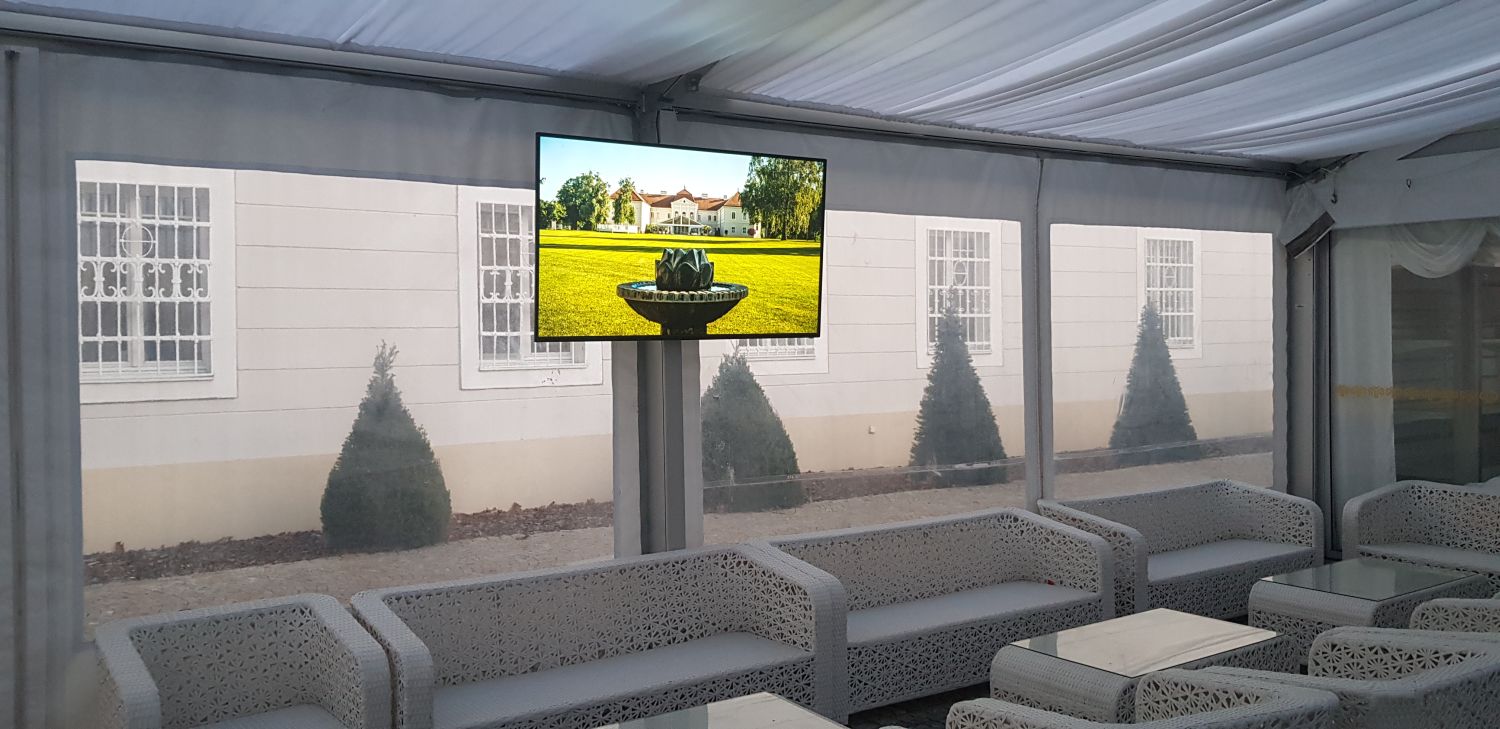 There was no TV in the courtyard and as it is mostly outdoor area with TV mount prepared under the tent, we had to pick more durable display. We decided to go with BenQ Smart Signage display ST650K with 65″ 4K screen, which is certified for 16/7 usage. Thanks to Android installed directly on the display, there was no need to add additional Android box. We installed Slideshow on Android (you can find more information about the installation here) and connected the display to internal network via LAN cable.