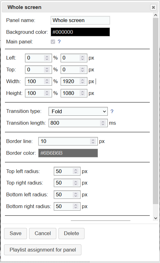 - Position and size, either in percentage or in pixels (automatically recalculated)