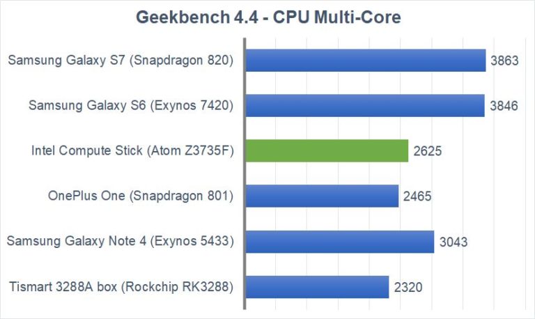 Results for Intel Compute Stick and Tismart 3288A box were measured as a average of two runs. Other results are a courtesy of Geekbench results database.