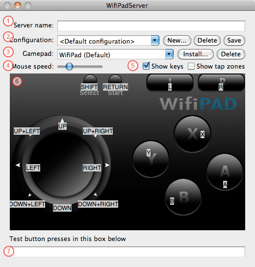 1. Optional. You can specify the server name here. The server name appears on the WifiPad client when queried. 2. This drop-down box contains a list of saved key configuration. A configuration is a set of defined keys for a gamepad. For example, you can create a configuration called "Game X Player 1" with key bindings for player 1 for a specific game. A default configuration is provided for convenience, but you will be required to create a configuration in order to change the keys. 3. The Gamepad drop-down box lets you select a gamepad. WifiPad allows different gamepad themes to be installed. Go here to find more gamepads. 4. This adjusts the speed of the cursor for mouse operations. 5. The Show Keys and Show Tap Zone checkboxes allow you to see the keys on the gamepad configuration view as well as the tap zones. 6. This is preview of the gamepad. By clicking on a tap zone of a button, you can change the key assignment. You must select a configuration in the Configuration drop down box in order to change the keys. Remember to click "Save" or your changes will not be applied. 7. This is a text field which you can use to test key presses from the client. Assigning keysIn order to change keys, a configuration must be created. Click on the "New..." button next to the configuration drop-down box. Enter a configuration name and click OK. Once you have created a configuration, you can start assigning keys to the gamepad. Select the configuration that was just created from the drop-down box and choose the gamepad you wish to configure. By clicking on one of the tap zones of the button a window will pop up, allowing you to change the key.